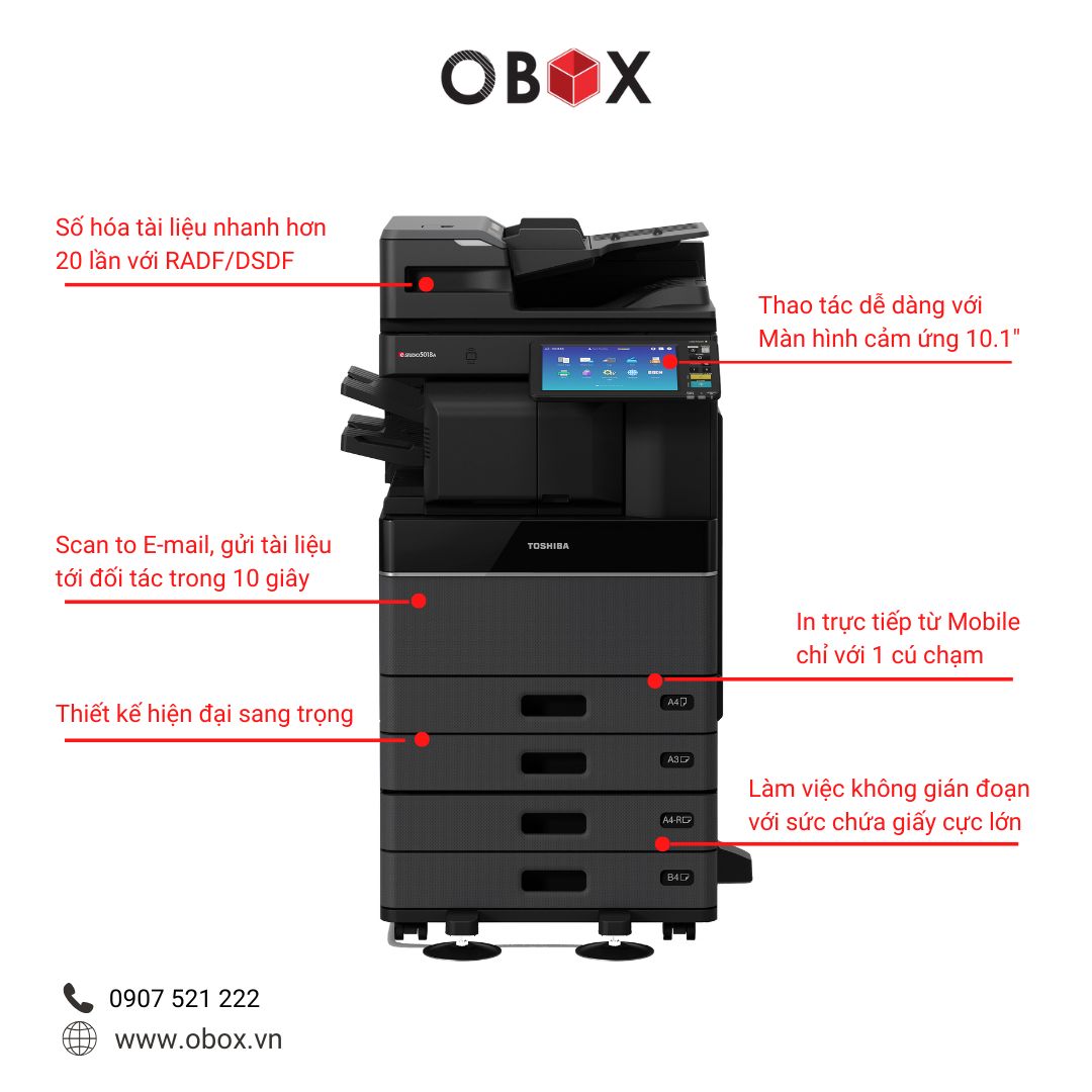 Máy hỗ trợ copy – in – scan – in hai mặt tự động, thao tác nhanh trên màn hình cảm ứng màu 10 inch, tiết kiệm điện và chi phí vận hành.